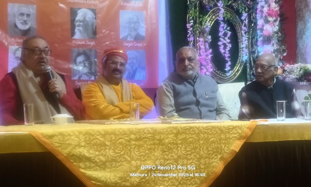 मथुरा (शिवशंकर शर्मा)। श्रीयश आर्ट गैलरी के तत्वाधान में आयोजित छह दिवसीय कला शिविर बृजराज-1 का सम्मान समारोह 24 नवंबर सोमवार को शहर के कृष्णा नगर स्थित मधुबन होटल में आयोजित किया गया जिसका शुभारम्भ मुख्य अतिथि पद्दमश्री कृष्ण कन्हाई और कथावाचक रमाकान्त गोस्वामी और गैलरी के निदेशकों व उनके परिवार द्वारा दीप प्रज्वलन अनुष्ठान के साथ किया गया, गैलरी के प्रमोटर महेश अग्रवाल, श्रीमती सविता अग्रवाल, मोहित अग्रवाल व उदित अग्रवाल ने माला व पटुका पहनाकर मुख्य अतिथियों का स्वागत अभिनन्दन किया, वहीं समारोह के दौरान एक कलाकार द्वारा भावपूर्ण प्रार्थना-पद्य प्रस्तुत किया गया । श्रीयश आर्ट गैलरी की निदेशक श्रीमती सविता अग्रवाल ने देशभर के भिन्न-भिन्न राज्यों से पधारे कलाकारों की सराहना करते हुए कहा कि सभी कलाकारों ने राधाकृष्ण की छवि को अपने हृदय में संजोया है जिससे वे कैनवास पर भावपूर्ण कलाकृतियाँ रचने में सक्षम हुए, गैलरी की सह-निदेशक श्रीमती यामिनी अग्रवाल ने कहा कि श्रीयश परिवार और भी बड़ा और सुंदर होता जा रहा है, इस शिविर का उद्देश्य अत्यंत एकाग्रता के साथ एक सकारात्मक वातावरण को बढ़ावा देना है जिससे प्रत्येक कृति में जीवन का संचार हो । परम पूज्य गुरुजी श्री आचार्य गोविंद स्वामी जी ने एक श्लोक का पाठ किया जिसने इस सम्मान समारोह की शाम को एक धार्मिक लय निर्धारित कर दी, मुख्य अतिथि कथावाचक रमाकांत गोस्वामी ने सभी कलाकारों की प्रशंसा करते हुए उनका उत्साहवर्धन किया जबकि पद्दमश्री कृष्ण कन्हाई ने श्री यश आर्ट गैलरी के आयोजकों की सराहना करते हुए आग्रह किया कि ऐसे सांस्कृतिक रूप से समृद्ध कार्यक्रम प्रतिवर्ष आयोजित किए जाने चाहिए, वहीं पूर्व ऊर्जा मंत्री रविकांत गर्ग ने पूरे भारत के कलाकारों को एक साथ लाने में बृजबासी परिवार की ऊर्जा की सराहना की, साथ ही उन्होंने उत्तर प्रदेश के मुख्यमंत्री योगी आदित्यनाथ की ओर से आयोजनकर्ताओं व कलाकारों को बधाई व शुभकामनाएं प्रेषित कीं । मुख्य अतिथि कथावाचक रमाकांत गोस्वामी, पद्दमश्री कृष्ण कन्हाई व पूर्व राज्य मंत्री रविकांत गर्ग द्वारा श्री यश आर्ट गैलरी द्वारा आयोजित छह दिवसीय कैम्प में देशभर से प्रतिभाग करने वाले पंद्रह कलाकारों अनीता कुलकर्णी, अशोक राठौड़, बृजमोहन आर्य, धर्मेंद्र राठौर, कृष्ण कपारी, मदन लाल, मानस रंजन जेना, मोहन सिंह, प्रणाम सिंह, संजीब गगोई, श्यामल मुखर्जी, सुकांत दास, सुब्रत दास, स्वप्न रॉय, विलास कुलकर्णी को उनकी उल्लेखनीय कृतियों के लिए सम्मानित किया गया और कहा कि प्रत्येक कलाकार प्रतिभा व विशिष्टता का खजाना है । समारोह के अंत में धन्यवाद ज्ञापन करते हुए श्री यश आर्ट गैलरी के प्रमोटर महेश अग्रवाल ने इस बा