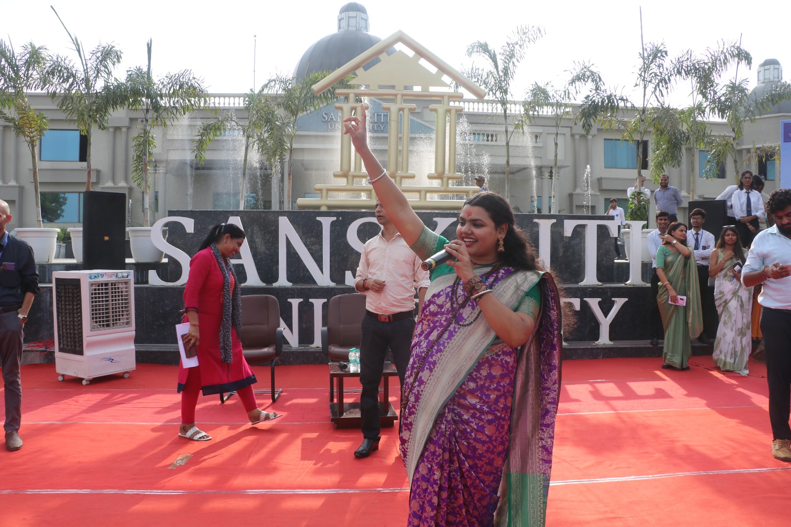 चित्र परिचयः संस्कृति विवि के मुख्य मैदान में छात्र-छात्राओं के बीच अभिलिप्सा पांडा।