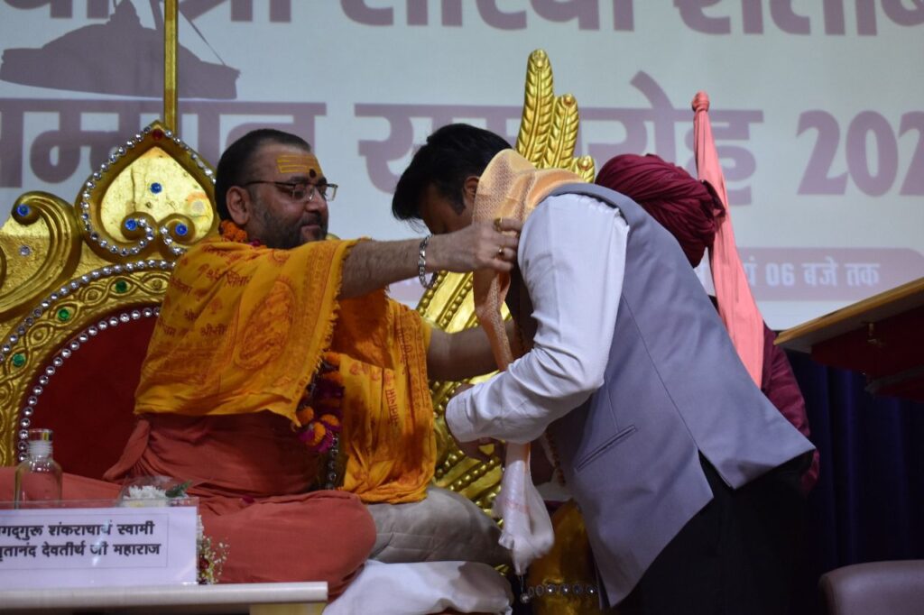 चित्र परिचयः14वें श्री शारदा शताब्दी सम्मान समारोह में श्रीमद् जगदगुरु शंकराचार्य शारदा सर्वज्ञ पीठाधीश्वर स्वामी श्री अमृतानंद देव तीर्थ जी महाराज संस्कृति विवि के कुलाधिपति डा. सचिन गुप्ता को सम्मानित करते हुए।