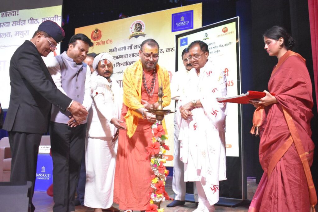 दीप प्रज्ज्वलन के बाद संस्कृति विवि के संतोष मैमोरियल सभागार में श्रीमद् जगदगुरु शंकराचार्य शारदा सर्वज्ञ पीठाधीश्वर स्वामी श्री अमृतानंद देव तीर्थ जी महाराज की उपस्थिति में सनातन संस्कृति की पवित्र धारा को विश्व मंच पर प्रज्ज्वलित करने वाली प्रतिष्ठित हस्तियों को श्री शारदा शताब्दी विद्या-विवेक रत्न, श्री शारदा वाणी-प्रकाश रत्न, श्री शारदा शताब्दी शक्ति-नाद रत्न प्रदान किए गए। महाराष्ट्र के उप मुख्य मंत्री एकनाथ शिंदे को उनकी अनुपस्थिति में उनके प्रतिनिधि को, विजन दिव्यांग फाउंडेशन के अध्यक्ष मुकेश गुप्ता, सेवानिवृत आईएएस डा. विश्वपति त्रिवेदी, सचिव ग्रामीण विकास एवं पंचायती राज विभाग जम्मू,आईएएस एजाज असद को उनकी अनुपस्थिति में उनके प्रतिनिधि को, पूर्व डीजीपी आईपीएस ओम प्रकाश सिंह, सागर शिवाजी राव जोंघले मुबई, अखिल भारतीय श्रध्दालु सभा ब्रज किशोर दुबे, लोक नायक ओरछा, मध्य प्रदेश उमेश यादव, संस्कृति विवि की सीईओ डा. मीनाक्षी शर्मा, अखिल भारतीय फुटवीयर एसोसिएशन के अध्यक्ष पूरन डावर, संयुक्त सचिव भारतीय विवि संघ आलोक कुमार मिश्र को श्री शारदा शताब्दी विद्या-विवेक रत्न 2025 से सम्मानित किया गया। अतिरिक्त पुलिस अधीक्षक संभल आईपीएस कु. अनुकृति शर्मा, वरिष्ठ पेशेवर भारतीय सेना से सेवानिवृत मेजर जनरल हरि सिंह, बनारस हिंदू विवि की डा. प्रियंका सिंह, उद्योगपति, पर्यावरणविद् मथुरा रंजीत चतुर्वेदी, पूर्व सैन्य अधिकारी जम्मू एंड कश्मीर डा. अशोक रैना, सेवा निवृत वायु सेना अधिकारी स्क्वाड्रन लीडर अतुल कुमार सिंह, समाजिक कार्यकर्ता आगरा, मनीष अग्रवाल, प्रबंधक श्रीमती शांति देवी डिग्री कालेज आगरा भूप सिंह इंदौलिया, बरसिया एडवरटाइसिंग लि. के सीईओ भारत बरसिया को शारदा शताब्दी-वाणी प्रकाश रत्न 2025 से सम्मानित किया गया। डा. कृष्णकांत द्विवेदी, सैफ खान बाबा, कृष्ण चंद्र बाजपेयी, प्रो. डा. विनोद कुमार नागर, पूर्व कार्यकारी निदेशक, पावर ग्रिड कार्पोरेशन सुभाष चंद्र सिंह को शारदा शताब्दी शक्ति नाद रत्न 2025 से सम्मानित किया गया। सभी हस्तियों को शंकराचार्य शारदा सर्वज्ञ पीठाधीश्वर स्वामी अमृतानंद देव तीर्थ जी महाराज और कैबिनेट मंत्री चौ. लक्ष्मीनरायण द्वारा सम्मानित किया गया। श्रीमद् जगदगुरु शंकराचार्य शारदा सर्वज्ञ पीठाधीश्वर स्वामी श्री अमृतानंद देव तीर्थ जी महाराज द्वारा संस्कृति विवि के कुलाधिपति डा. सचिन गुप्ता को पटुका ओढ़ाकर, माला भेंटकर सम्मानित किया गया। सभी विशिष्ठ जनों को संस्कृति विवि के कुलाधिपति डा. सचिन गुप्ता द्वारा सम्मानित किया गया।