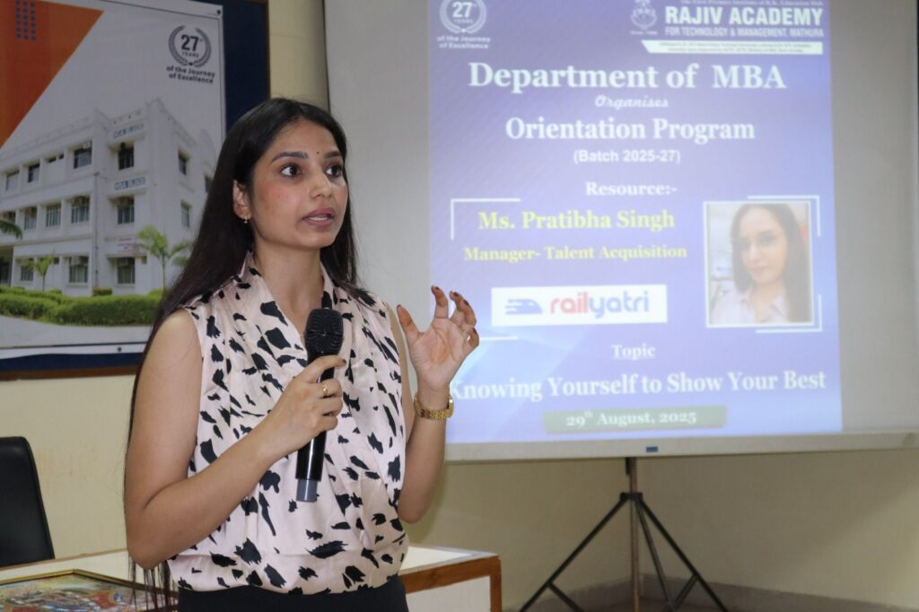 मथुरा। आत्मज्ञान और आत्मविश्लेषण बिना पेशेवर जीवन में सफलता की कल्पना नहीं की जा सकती। बेहतर टीम प्लेयर बनने, आत्म-सहानुभूति की क्षमता बढ़ाने तथा जीवन के उद्देश्य की स्पष्ट समझ पाने से न केवल व्यक्ति आत्म-प्रेरित होता है बल्कि वह कॉर्पोरेट वातावरण में अधिक अनुकूलनीय और सफल भी बनता है। यह बातें बुधवार को रेल यात्री की मैनेजर टैलेंट-एक्विज़िशन प्रतिभा सिंह ने राजीव एकेडमी फॉर टेक्नोलॉजी एंड मैनेजमेंट, मथुरा के नवागंतुक एमबीए छात्र-छात्राओं को बताईं।
