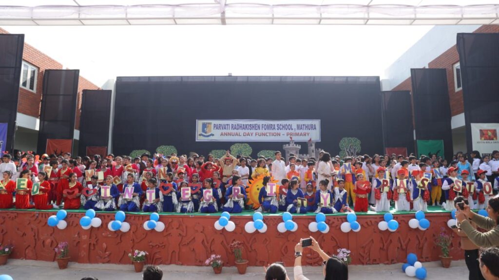 मथुरा दिनांक 6 दिसंबर।गोवर्धन रोड स्थित पार्वती राधाकिशन फोमरा स्कूल(बिरला स्कूल) में आज प्राथमिक वर्ग का वार्षिक उत्सव बड़े ही हर्षोल्लासपूर्ण, भव्य एवं मनोवेगपूर्ण माहौल में संपन्न हुआ। कार्यक्रम का शुभारम्भ आदित्य बिरला गान के साथ अत्यंत गरिमामयी वातावरण में हुआ।इस अवसर की मुख्य अतिथि प्रख्यात लेखिका श्रीमती गायत्री खन्ना रहीं। उन्होंने अपने प्रेरणादायी संबोधन में कहा —