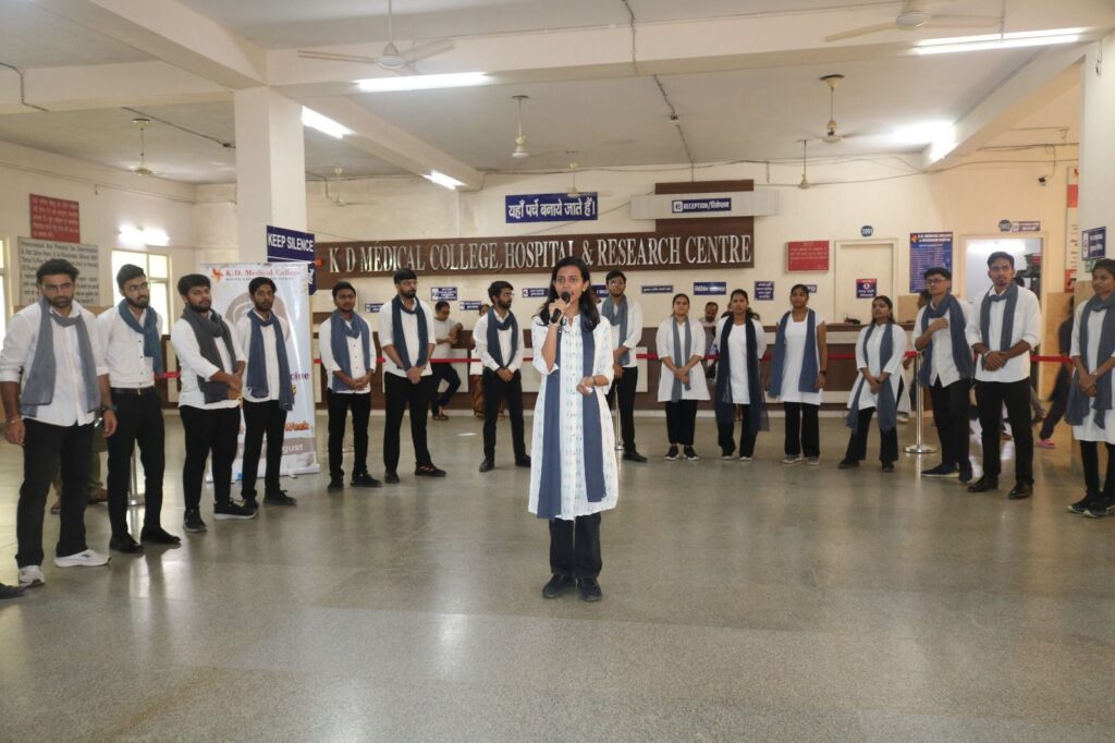चित्र कैप्शनः अतिथियों के साथ नुक्कड़ नाटक प्रस्तुत करने वाले के.डी. मेडिकल कॉलेज के छात्र-छात्राएं। नुक्कड़ नाटक प्रस्तुत करते विद्यार्थी।