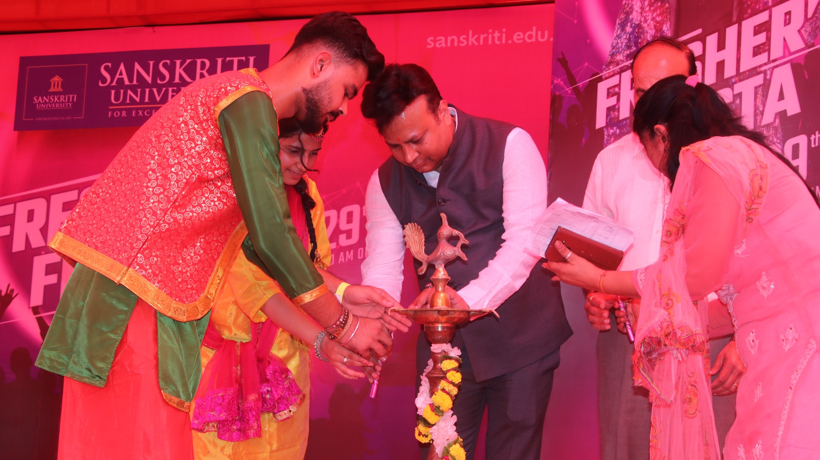 फ्रेशर फिएस्टा की शुरुआत विवि की परंपराओं के अनुसार दीप प्रज्ज्वलन से हुई। संस्कृति विवि के कुलाधिपति डा. सचिन गुप्ता, सीईओ डा. श्रीमती मीनाक्षी शर्मा, कुलपति एमबी चेट्टी द्वारा दीप प्रज्ज्वलन के तुरंत बाद विवि की छात्राओं ने गणेश वंदना पर मनमोहक नृत्य प्रस्तुत कर दर्शकों की खूब तालियां बटोरीं। छात्र अंकित और उनके साथियों ने पंजाब के प्रसिद्ध लोकगीत पर सामूहिक नृत्य प्रस्तुत किया। नए प्रयोग के तहत छात्र-छात्राओं ने कई सारे भजनों को पिरोकर एक सामूहिक गायन किया, जिसकी श्रोताओं ने दिल से ताली बजाकर प्रशंसा की। छात्रा लवली ने एकल नृत्य प्रस्तुत किया। छात्रा नेहा वीनू और कृतिका ने अपने नृत्य से पार्टी में हरियाणवी मिट्टी की सुगंध बिखेरी। पंडाल में उपस्थित हजारों छात्र-छात्राओं का जोश देखते ही बनता था। इसी तालियों के शोर के मध्य छात्र हिमांशु के एकल नृत्य ने सबको झूमने पर मजबूर कर दिया। एक छात्रा ने हरायणवी गीत सुनाया। छात्रा श्रुति और उनके साथियों ने राजस्थानी परंपराओं से ओतप्रोत एक सामूहिक नृत्य प्रस्तुत किया। छात्रा तनु और प्रभि ने लावनी नृत्य प्रस्तुत कर कार्यक्रम की विविधता को ऊंचाइयां दीं।