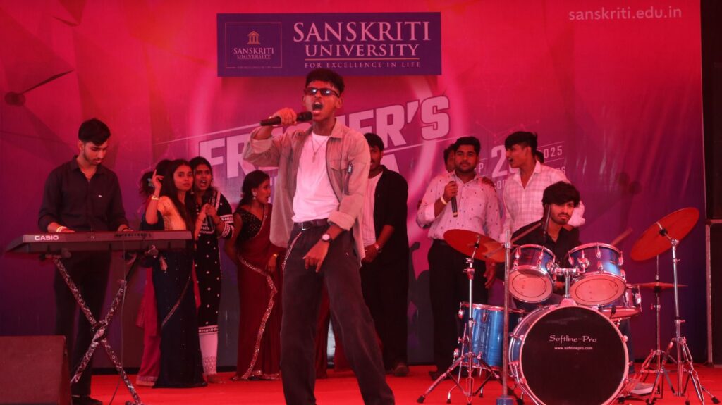 मथुरा। संस्कृति विश्वविद्यालय के विद्यार्थियों ने फ्रेशर फिएस्टा 2025 में गीत, संगीत और नृत्य की एक ऐसी त्रिवेणी बहाई कि पूरा विवि एक मस्ती के माहौल में रम गया। कई दिन से फ्रैशर फिएस्टा की तैयारियों में जुटे छात्र-छात्राएं आज मंच पर अपने कौशल और परिश्रम का परिचय दे रहे थे।