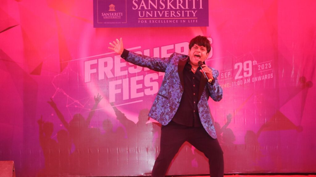मथुरा। संस्कृति विश्वविद्यालय के फ्रेशर फिएस्टा 2025 में हास्य कलाकार वीआईपी (विजय ईश्वर पवार) ने अपनी मिमिक्री से विवि के विद्यार्थियों को ऐसा फ्रेश किया कि वे अपनी सारी थकान भूल गए। बहुमुखी कलाकार वीआईपी ने न केवल प्रसिद्ध गायकों के गीतों को उन्हीं की आवाज बनाकर प्रभावशाली ढंग से गाया वरन एक बार में 52 कलाकारों की आवाज की नकल कर सबको दांतों तले उंगली दबाने पर मजबूर कर दिया।